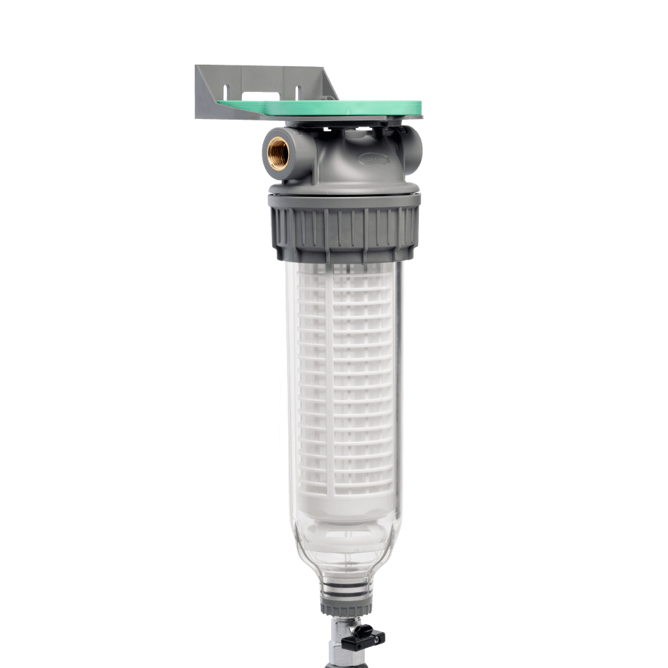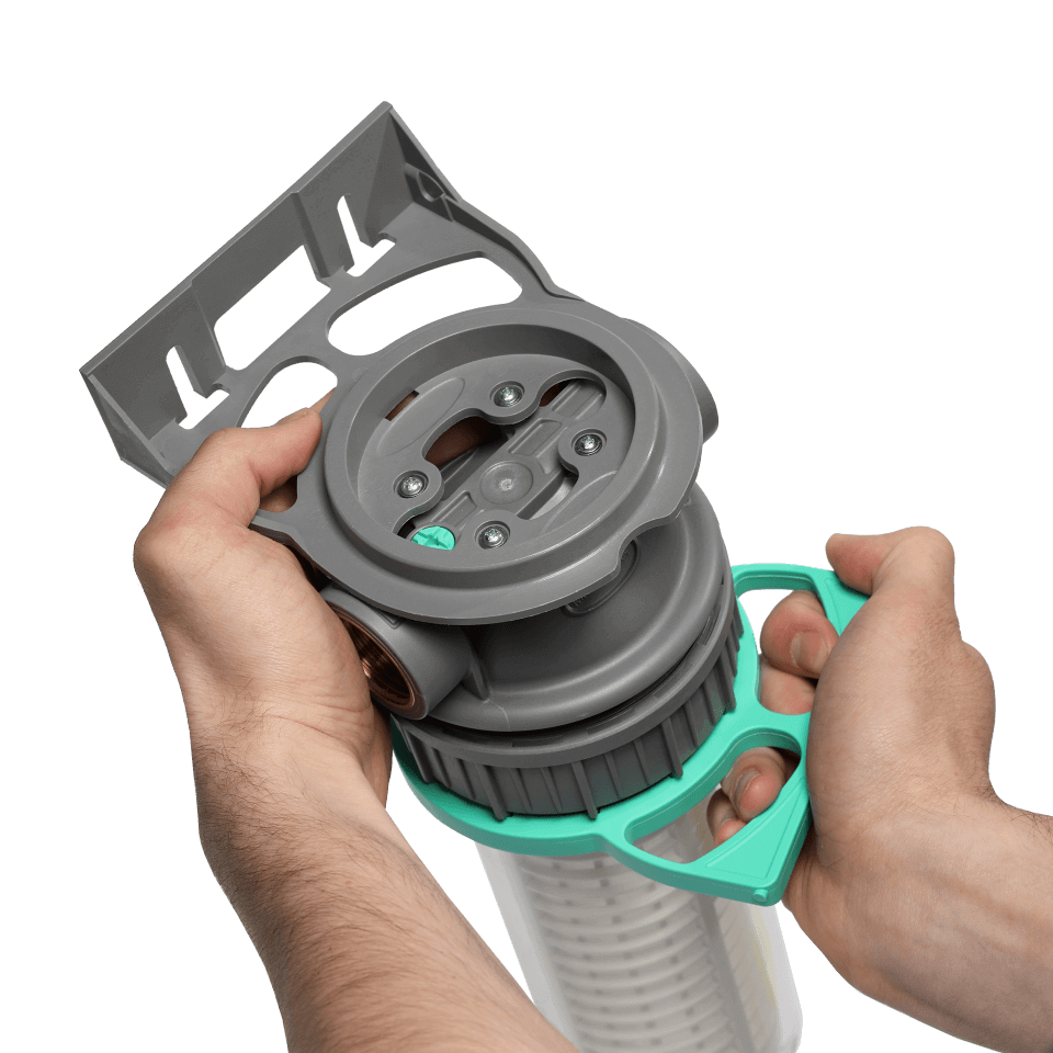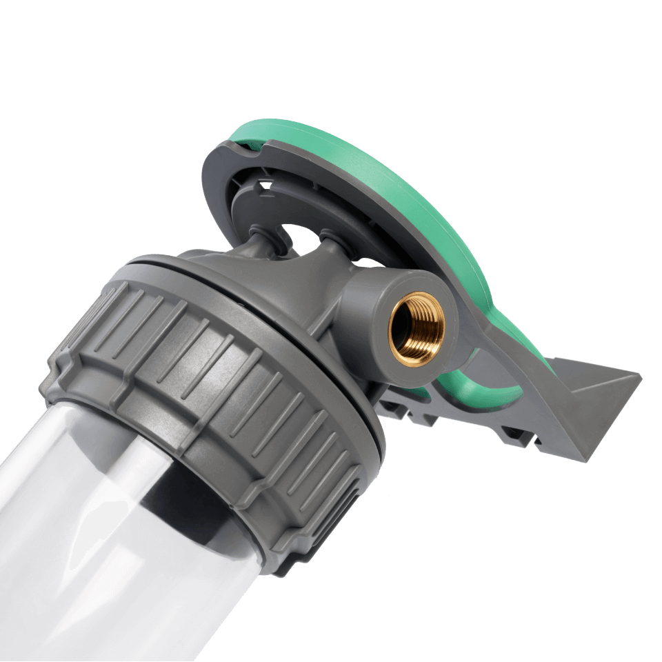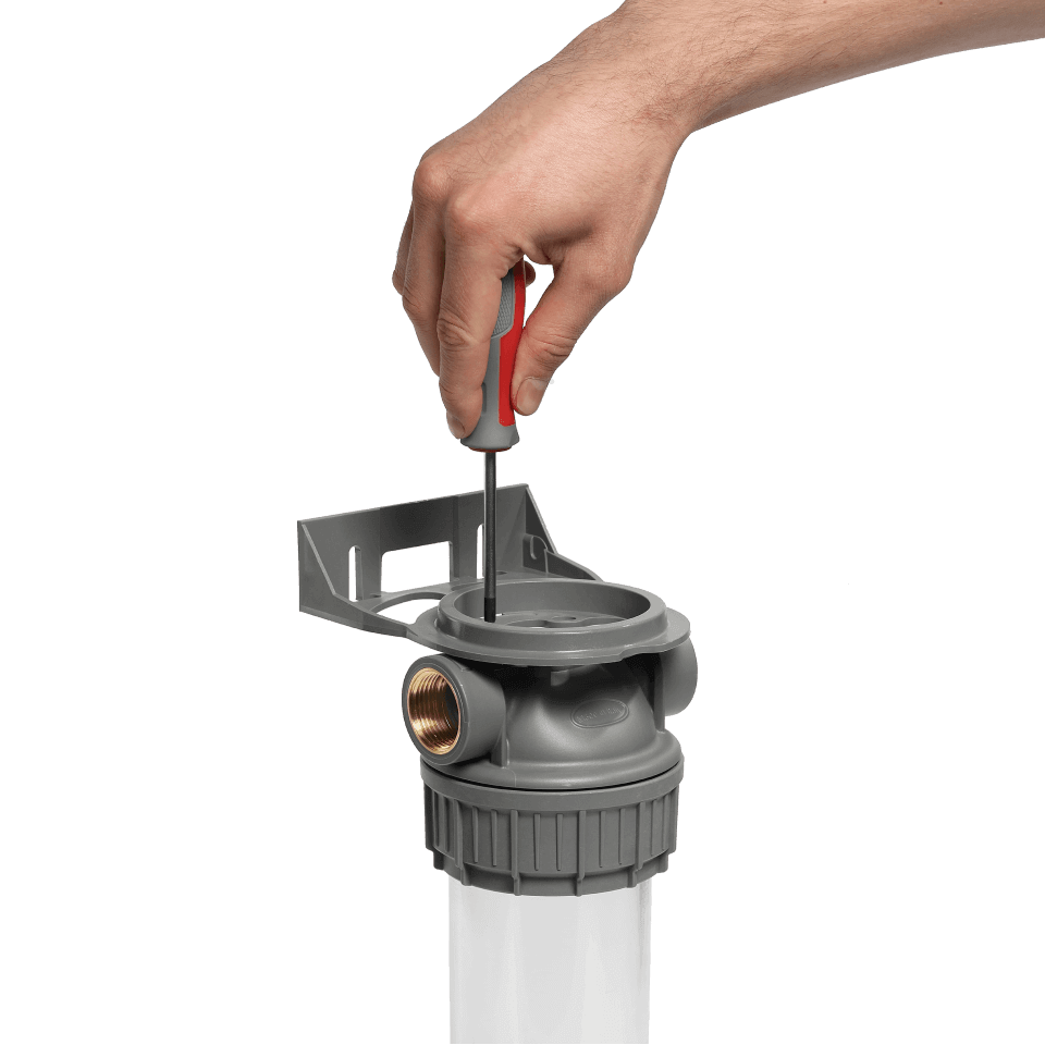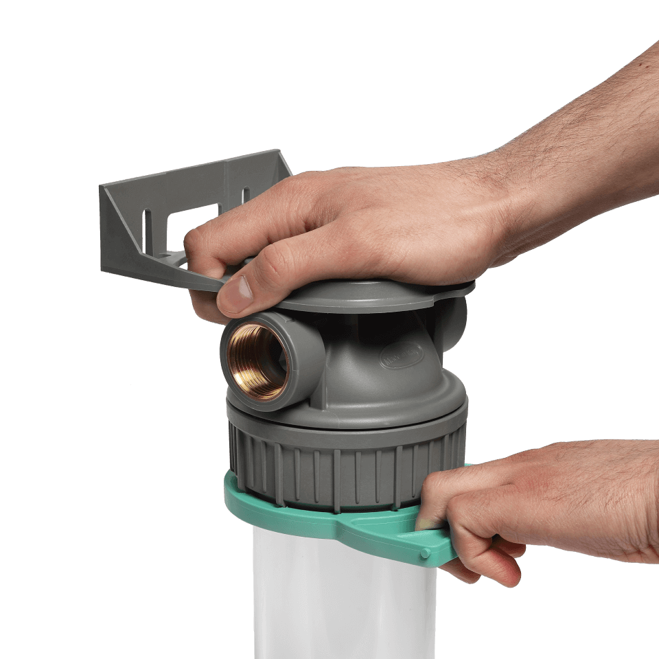 - Montare: fixați corpul filtrant pe suport sau direct pe țevă, respectând direcția fluxului indicată prin săgeata imprimată pe cap. Asigurați conectarea filetelor de ¾” la alimentarea și ieșirea de apă.