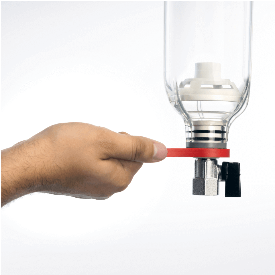 - Drain ½” (supapă de scurgere): orificiu de golire cu filete ½ inch, amplasat la baza bolului, prevăzut cu o supapă rotativă. Permite evacuarea sedimentelor și particulelor reziduale fără demontarea întregului ansamblu.
