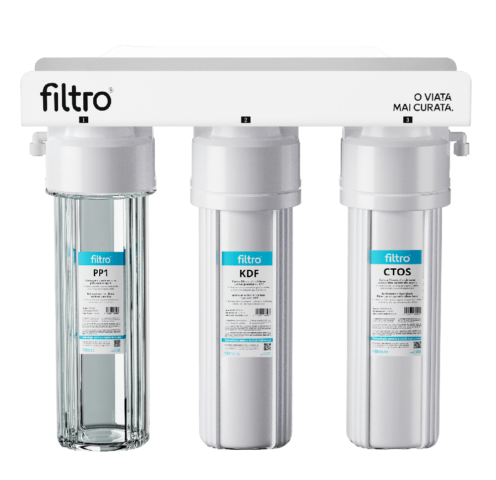 Sistem de filtrare a apei potabile in 3 stadii, cu montare sub blatul de bucatarie. Acest model este compus din 3 cartuse filtrante. Primul cartus filtreaza sedimentele mari si elimina complet rugina, nisipul si alte depuneri mai mari de 5 microni. Cel de-al doilea cartus dedurizeaza apa si elimina eficient fierul. Al treilea cartus elimina clorul, pesticidele, materiile organice, reduce concentratia de metale grele si imbunatateste gustul si mirosul apei.